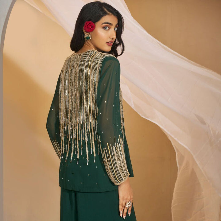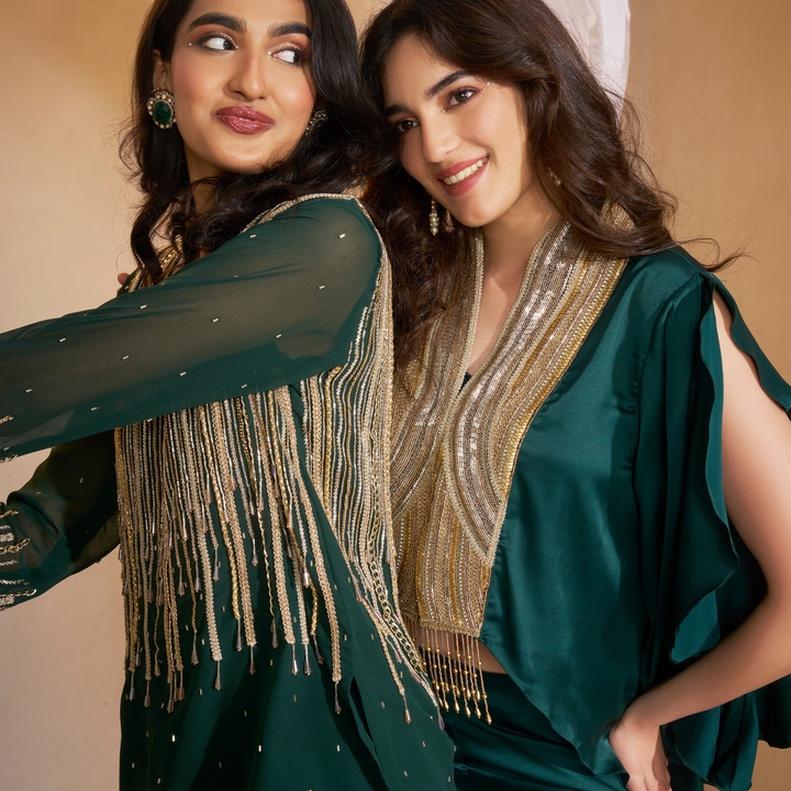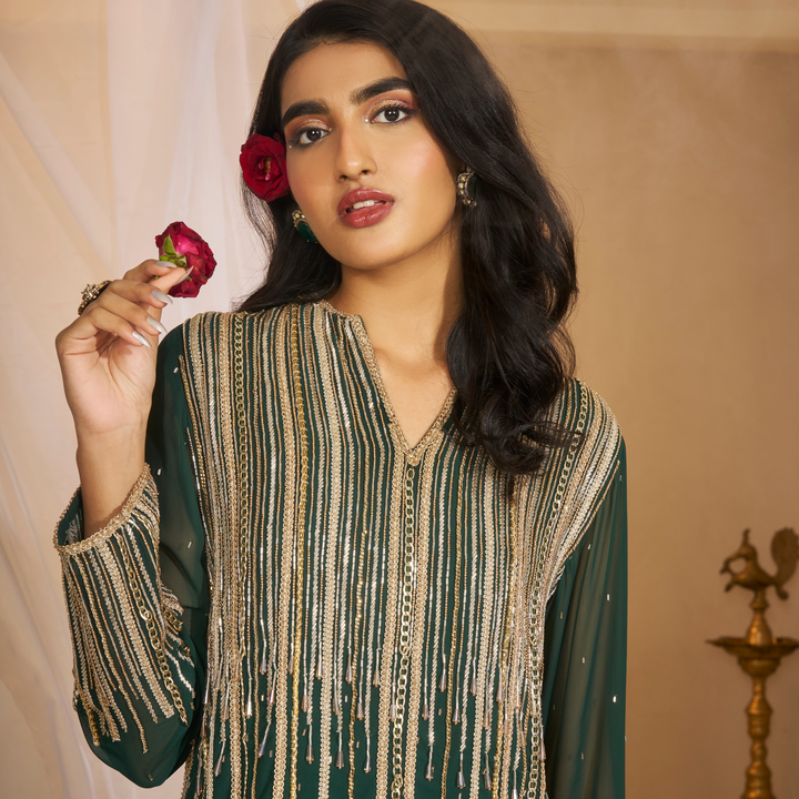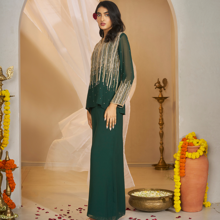 Georgette tunic with linear chain embellishments, paired with matching pants
