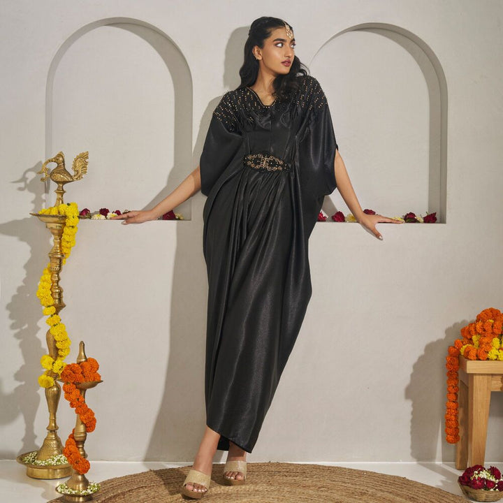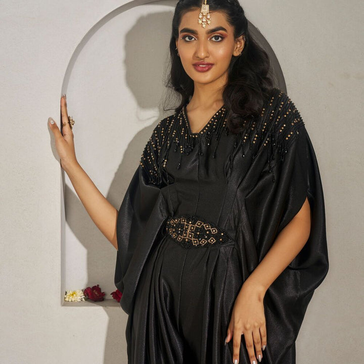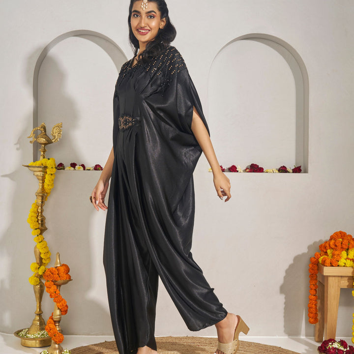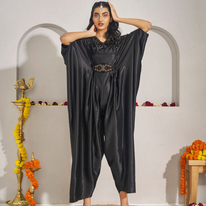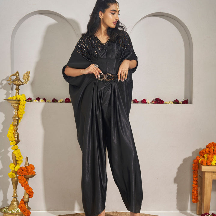 Satin silk cowl jumpsuit, highlighted with bead embellishments on the shoulder and belt