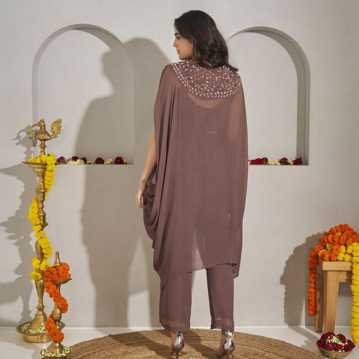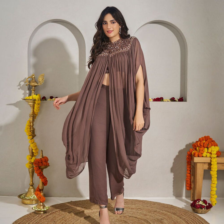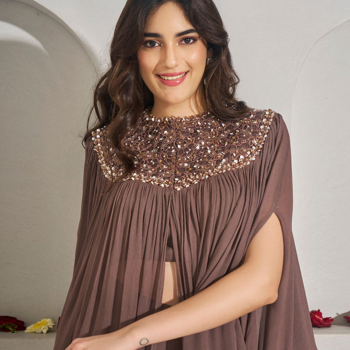 Georgette cowl tunic with an attached cutwork beaded bib, paired with a georgette bustier and matching pants