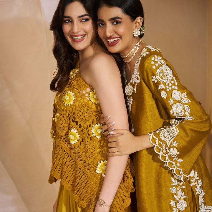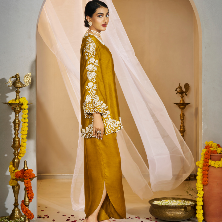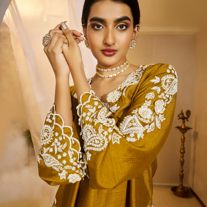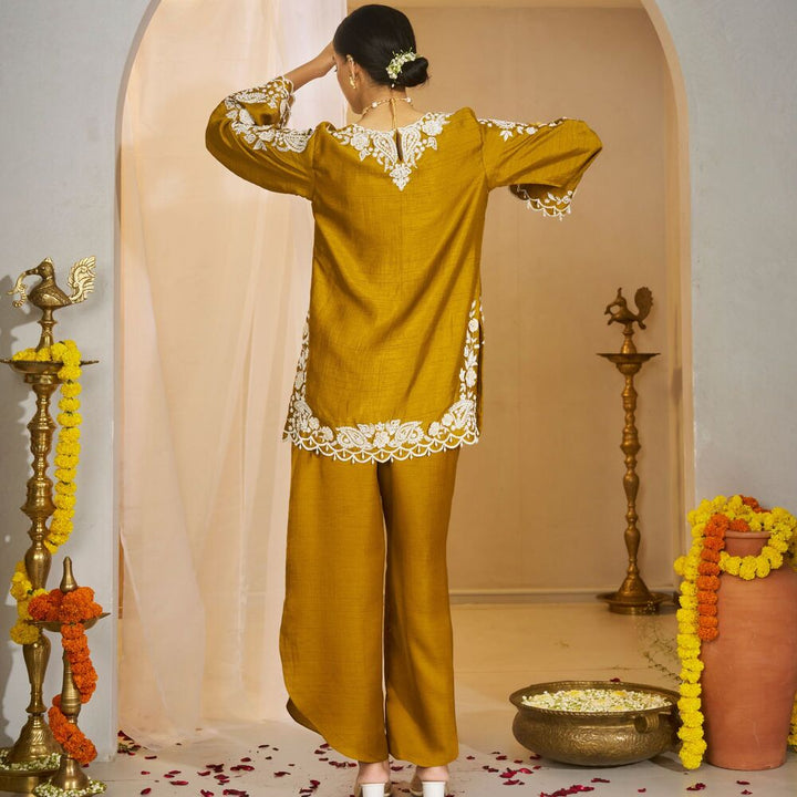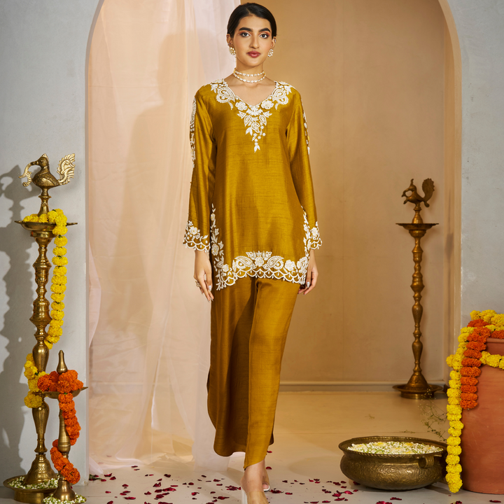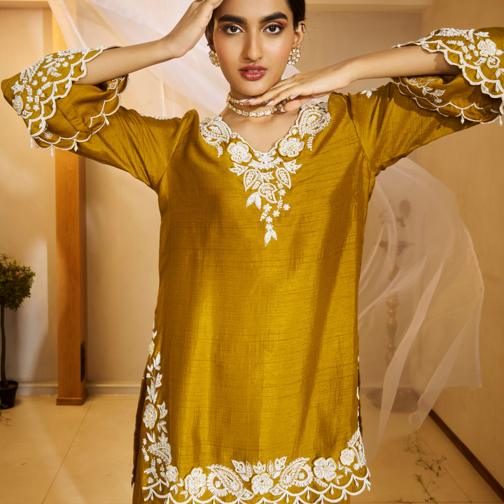 Short linen-satin tunic with 3D threadwork and pearl detailing on the neckline and sleeves, paired with U-shaped matching bottoms