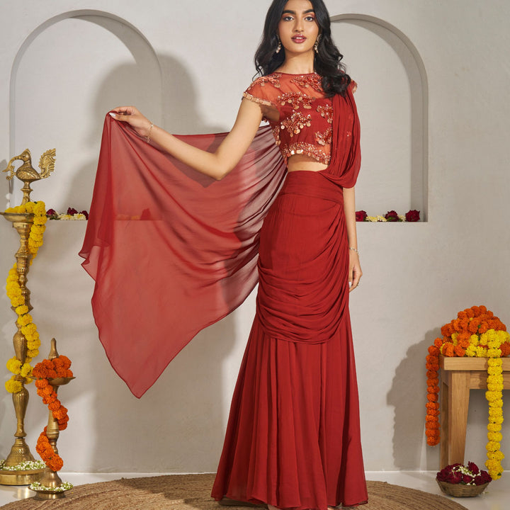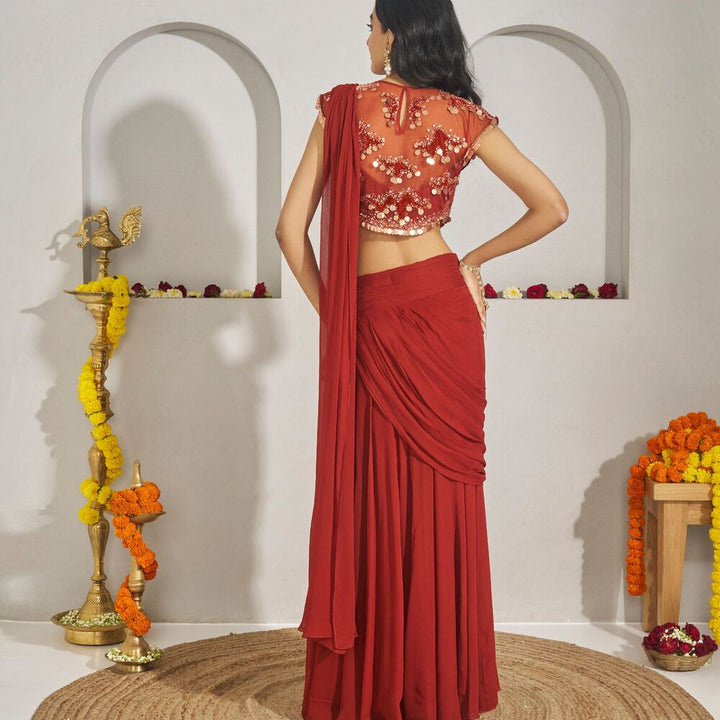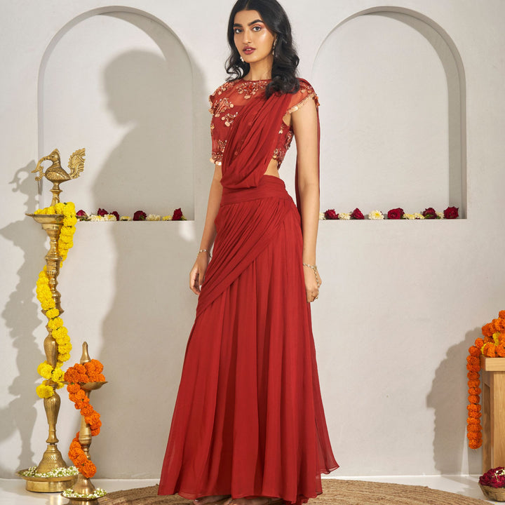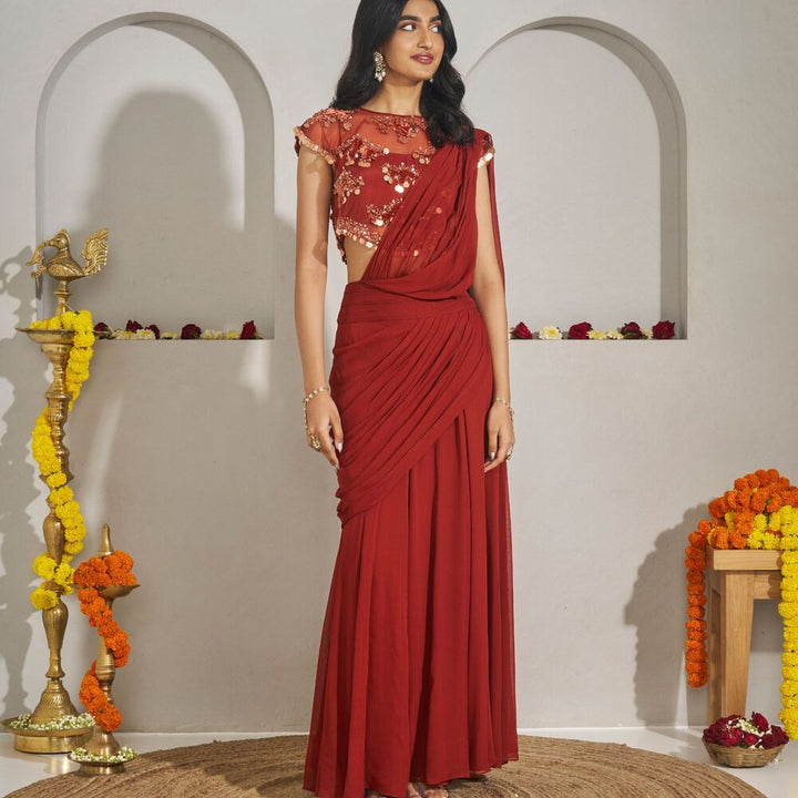 Draped georgette saree with an inverted pallu, paired with a velvet-appliquéd embroidered net cropped blouse and a structured bustier