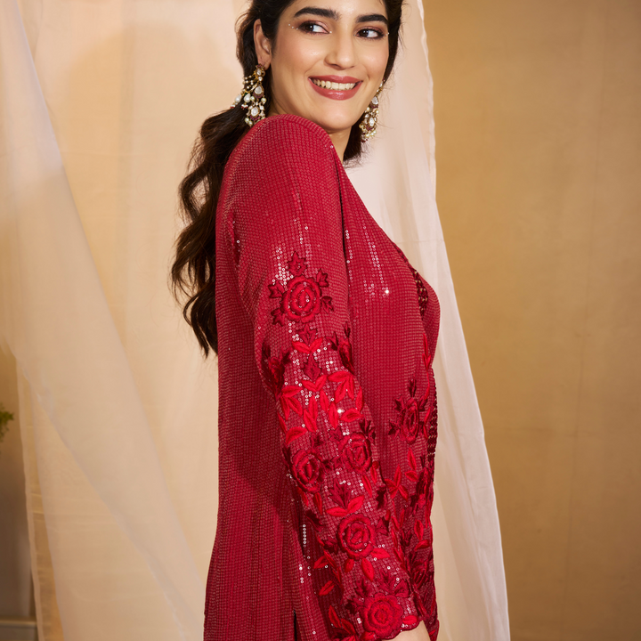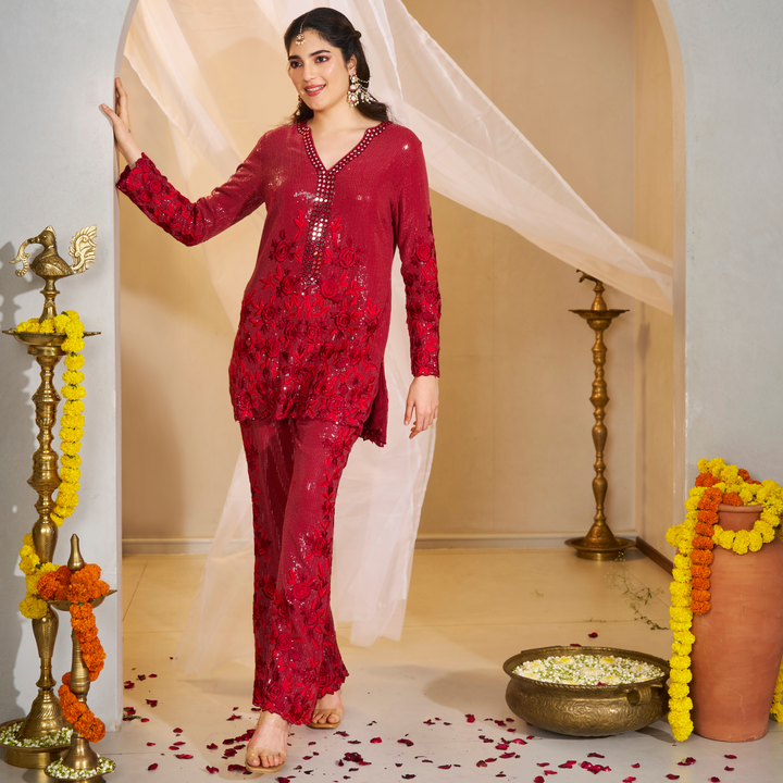 Sequin georgette tunic with thread and mirrorwork embroidery, paired with matching embroidered pants