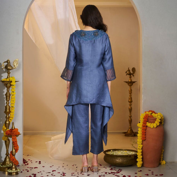 Symmetrical tunic adorned with 3D velvet florals and beadwork on the neckline, paired with matching pants