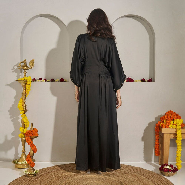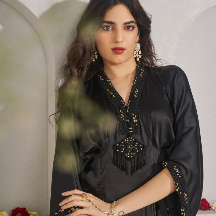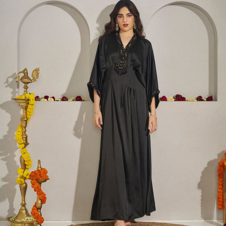 Satin silk draped kaftan, accented with intricate beadwork along the neckline and sleeves.