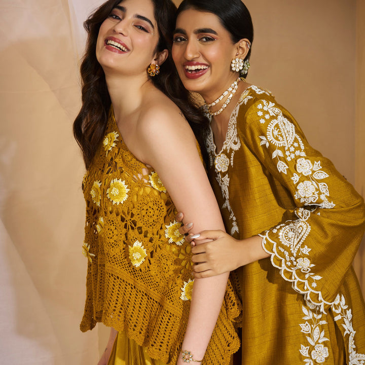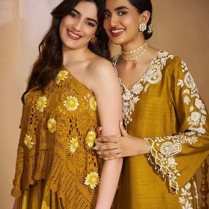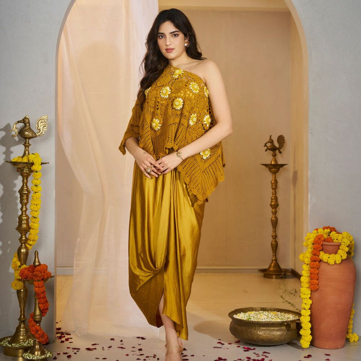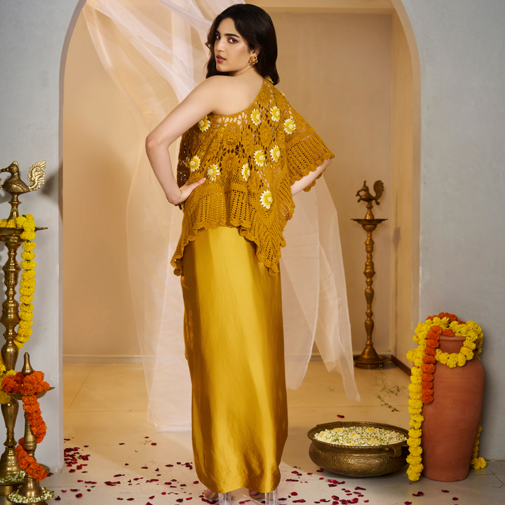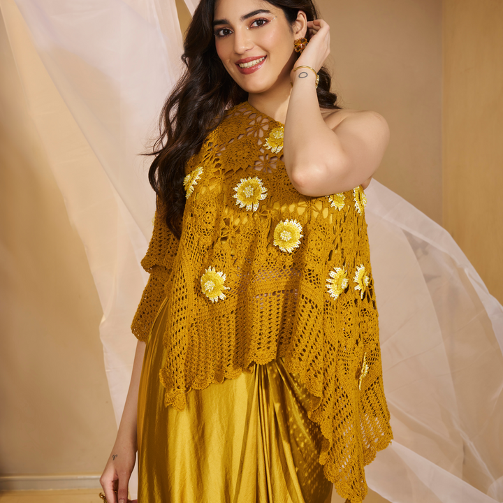Handcrafted crochet cape with 3D floral appliqué, paired with a silk satin bustier and a draped cowl skirt in silk satin