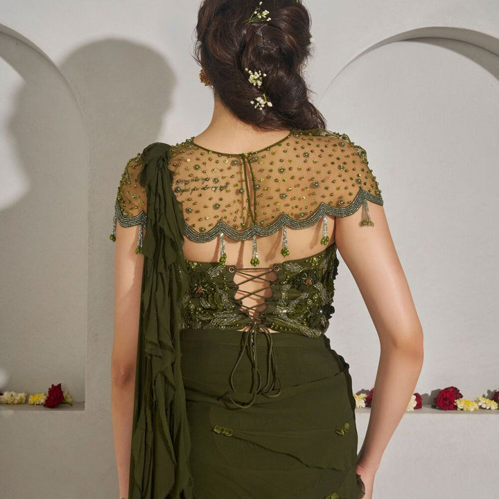 Draped georgette saree with a frilled pallu, styled with a 3D wildflower-embroidered net corset and an embellished net bib detailed with tassels